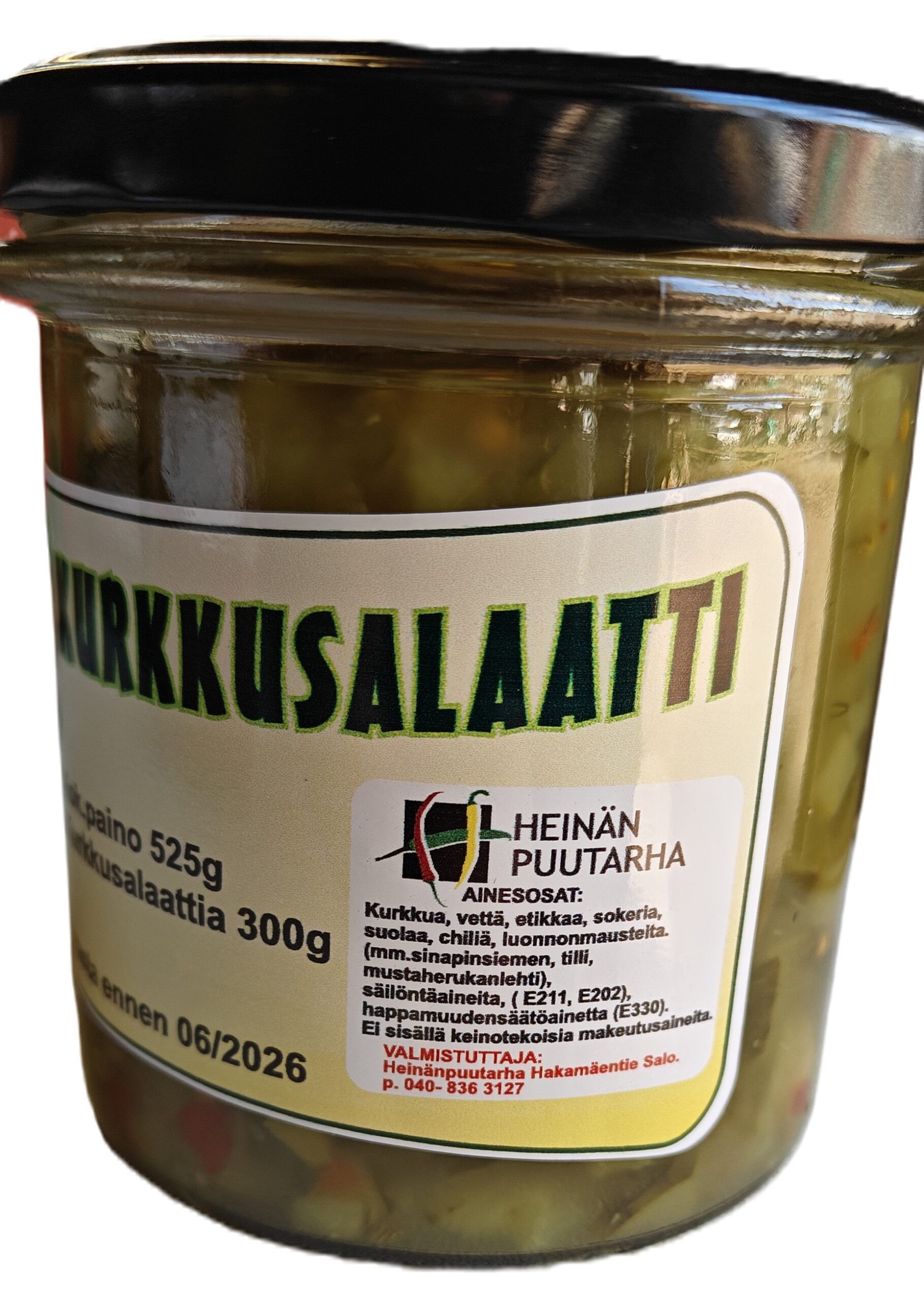 Gurka, vatten, vinäger, socker, salt, chili, naturliga kryddor (inklusive senapsfrön, dill, svarta vinbärsblad), konserveringsmedel (E211, E202),